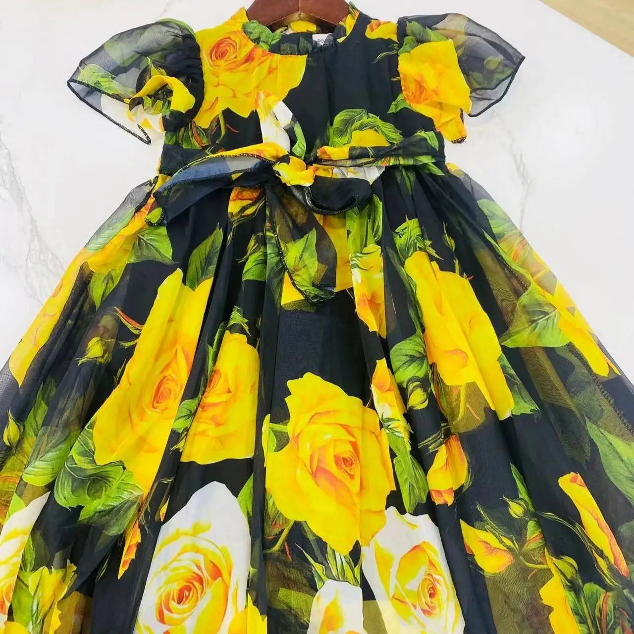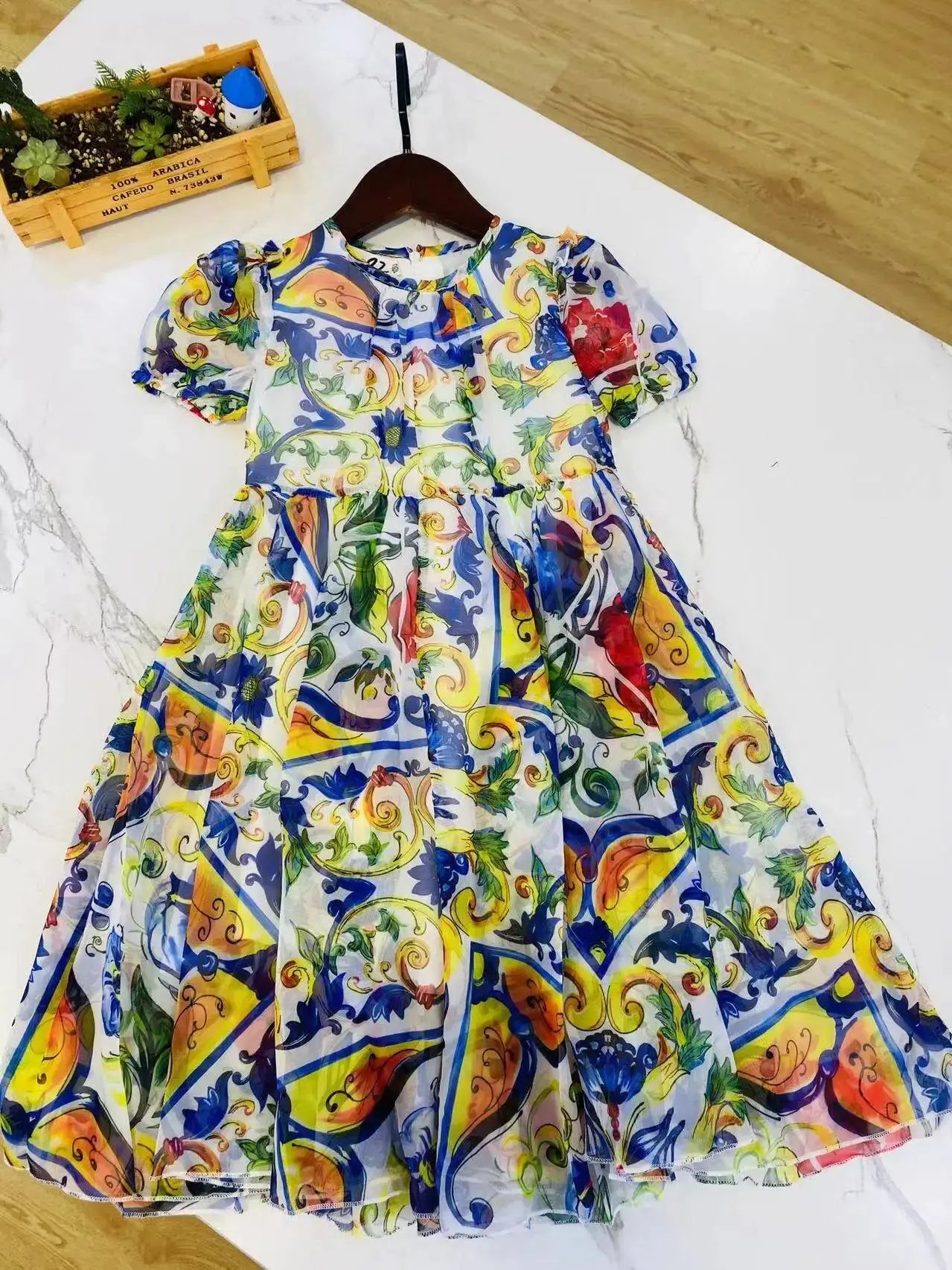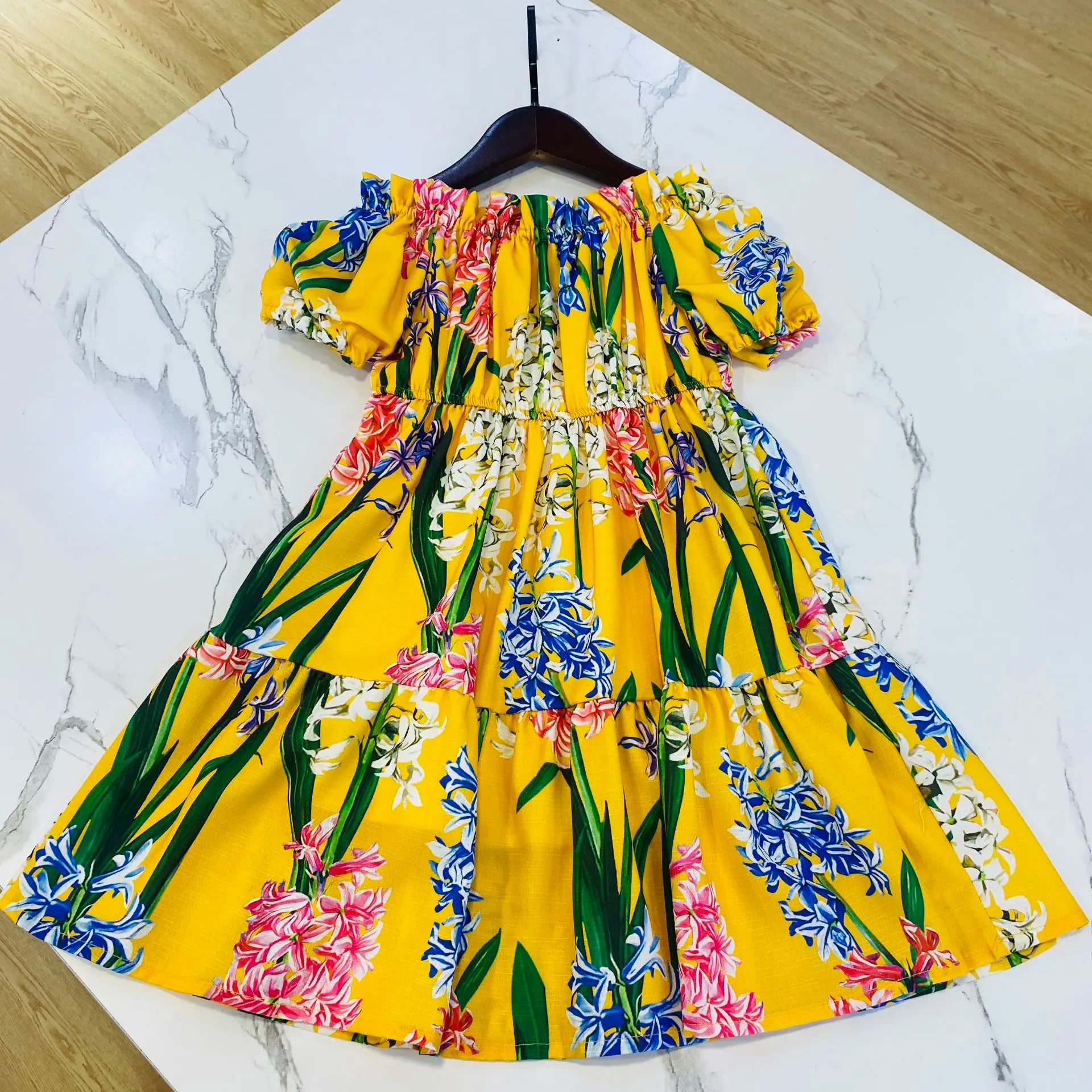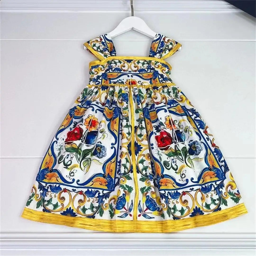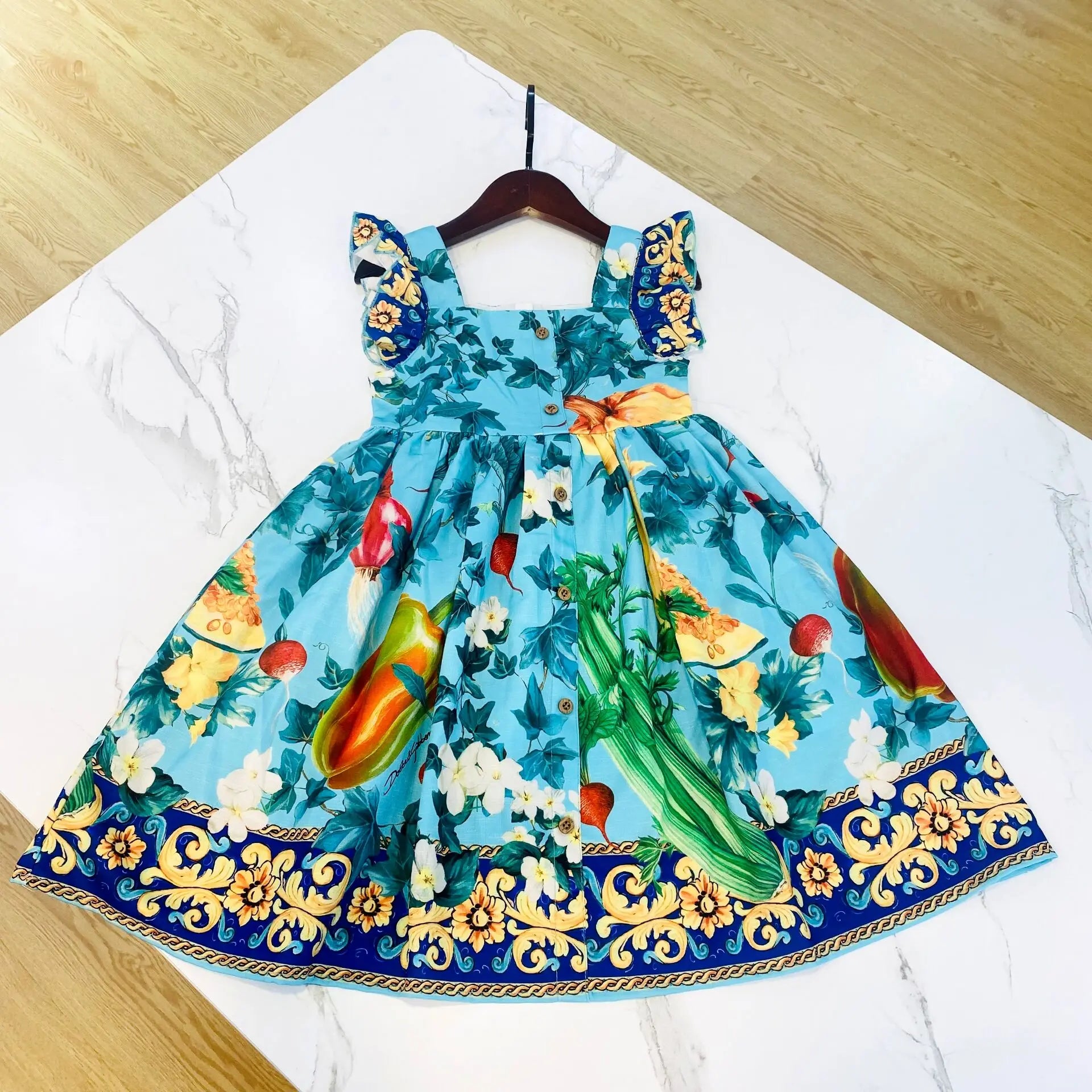 2024 latest style girl clothes green flower dress big girl vacation dress cotton floral printing kids dress