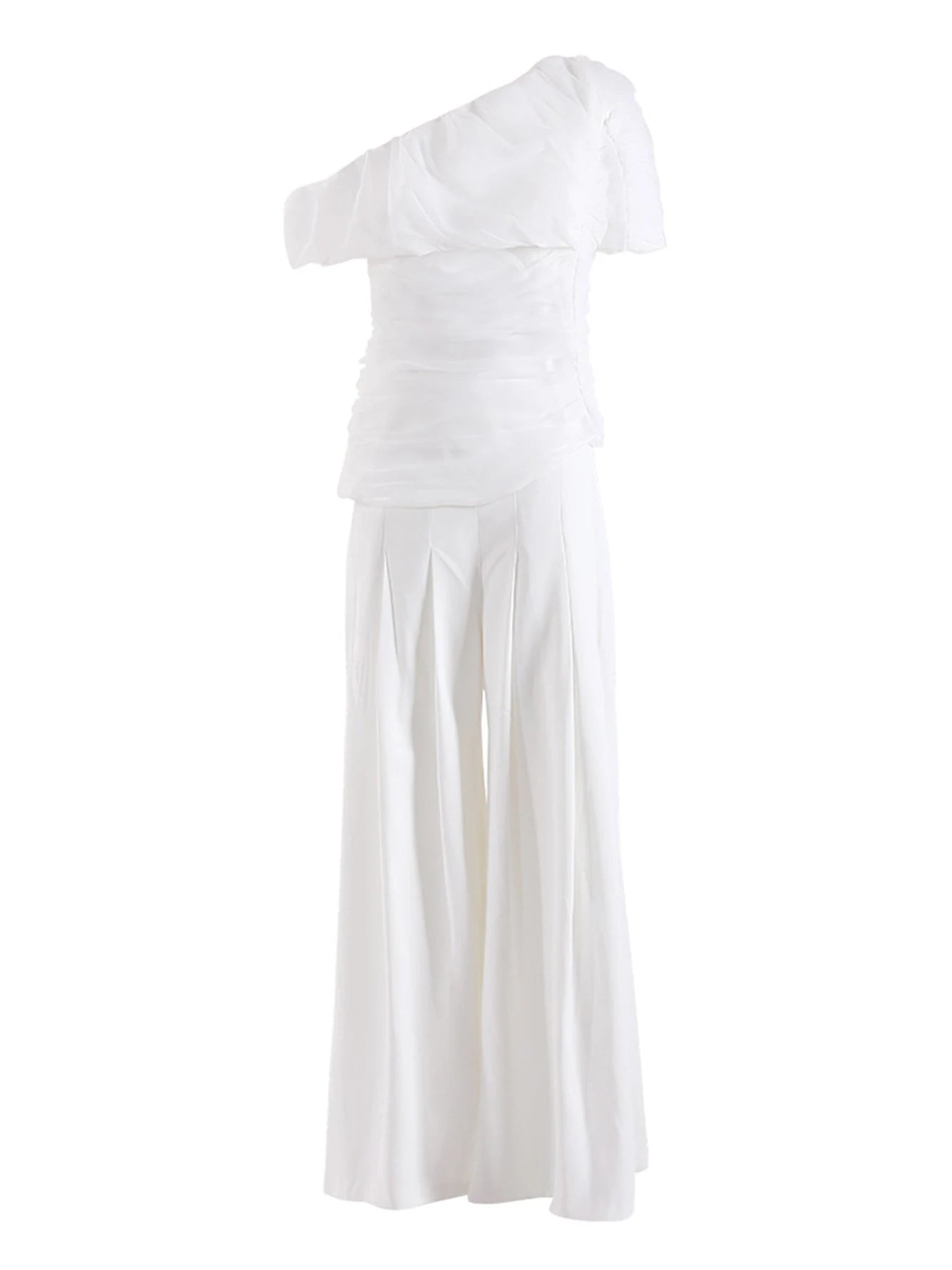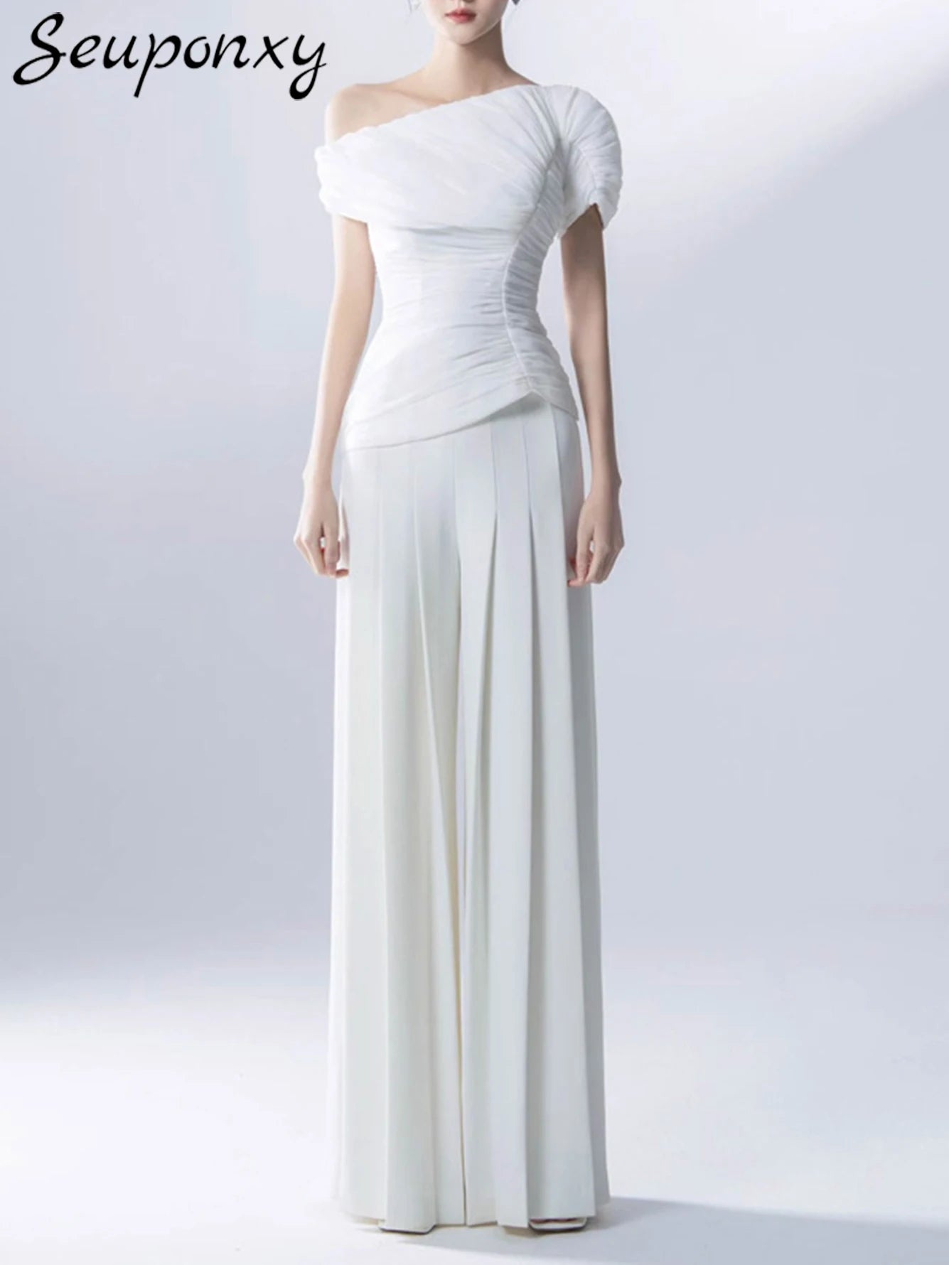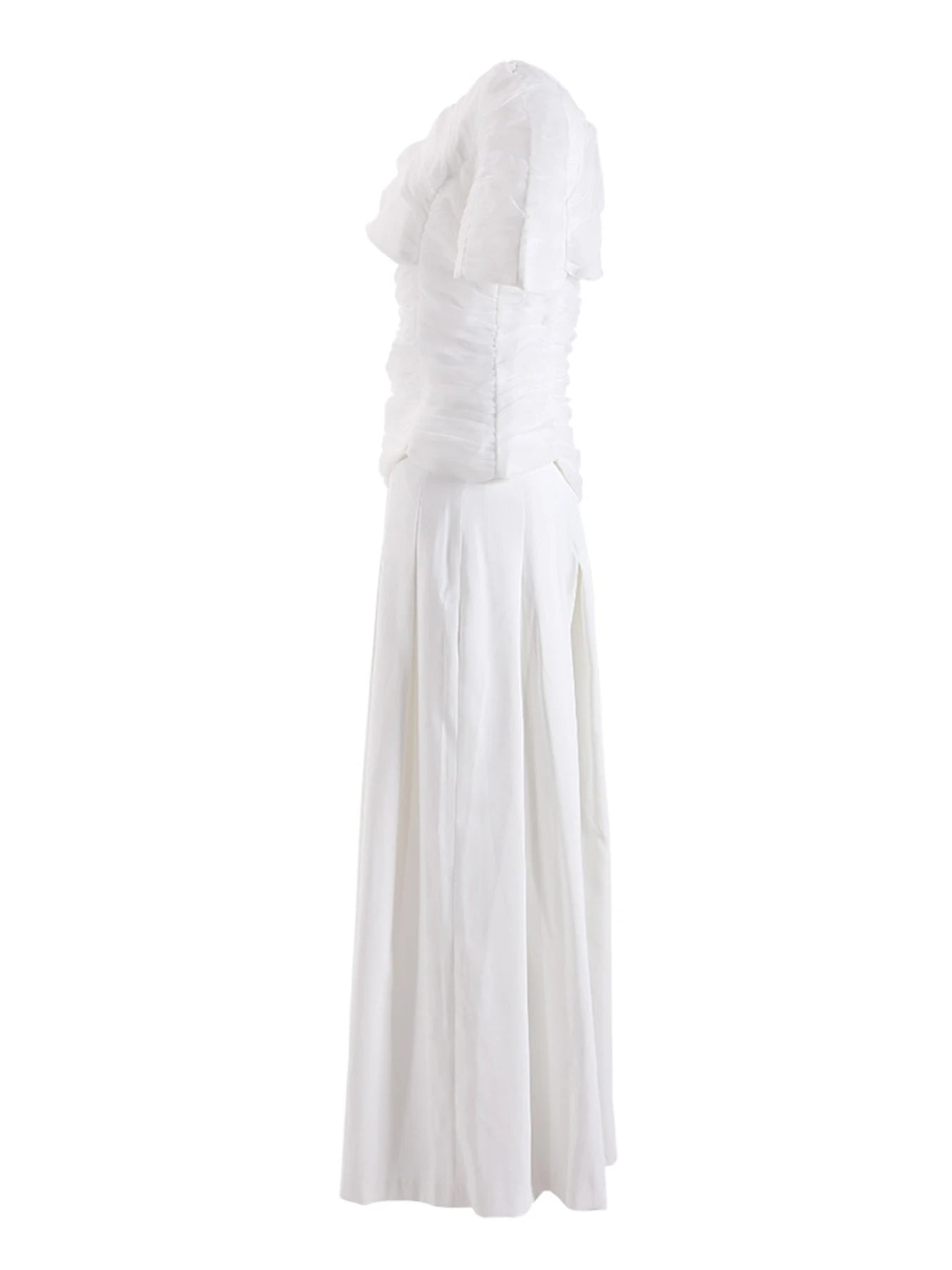 High Quality Summer New White Slim Set 2024 Sexy Short Sleeved Pleated Top+High Waisted Wide Leg Pants Party 2 Two-Piece Set