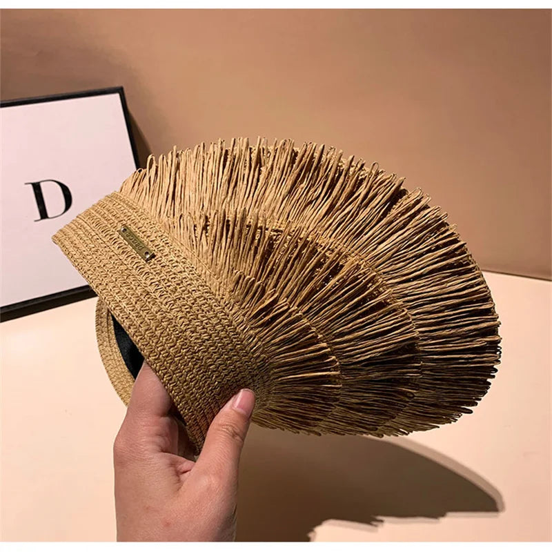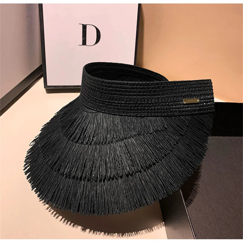 Luxury Pamama Sunscreen Tassel Straw Hats for Women Summer Empty Top Sun Hat Outdoor UV Protection Beach Sunshade Cap