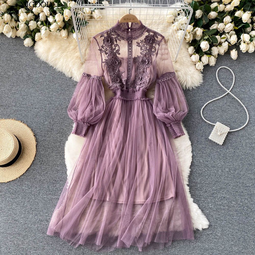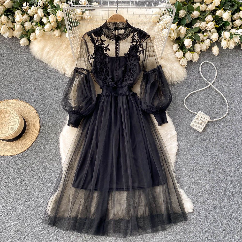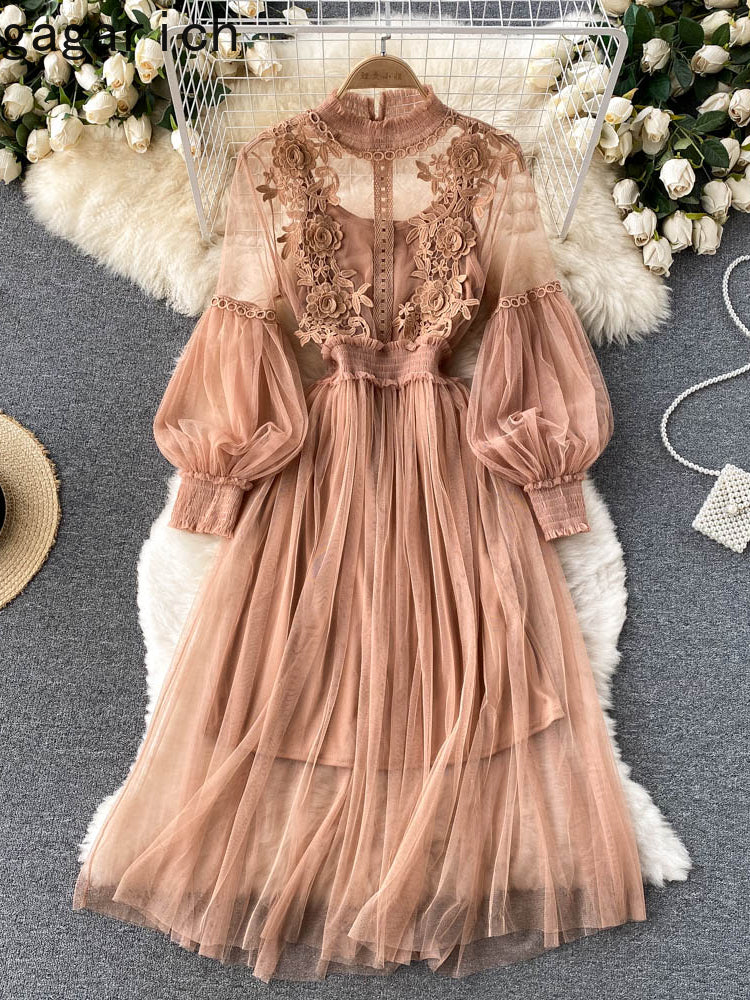 Mesh Lantern Sleeve Dress Set of 2 Mesh High Waist Lantern Sleeve Dress 2-Piece Set
