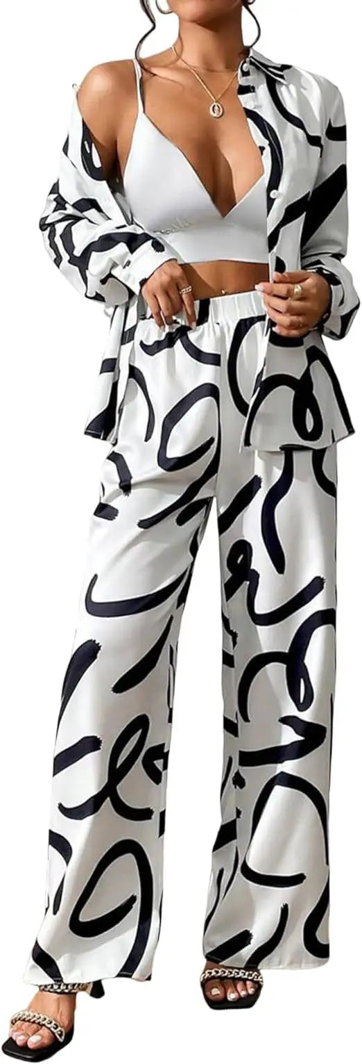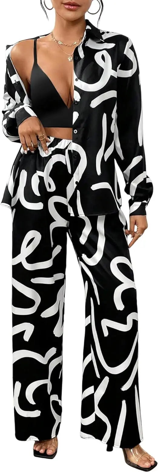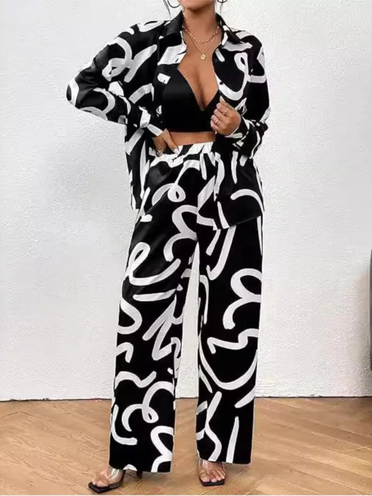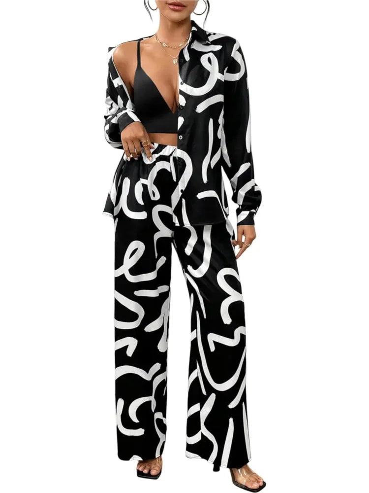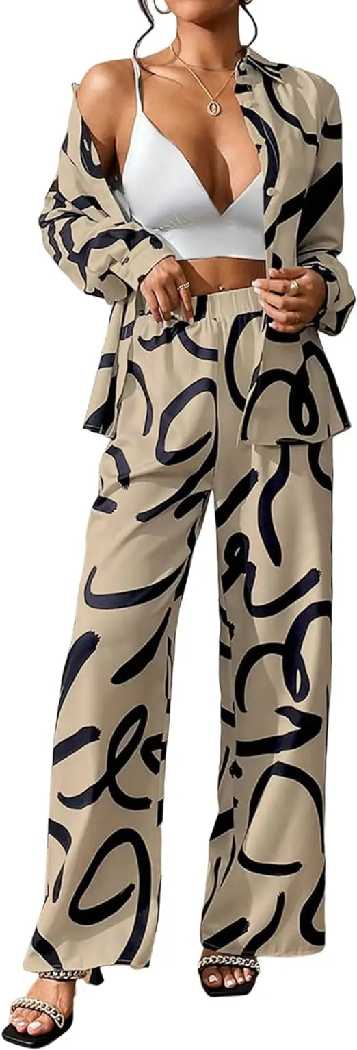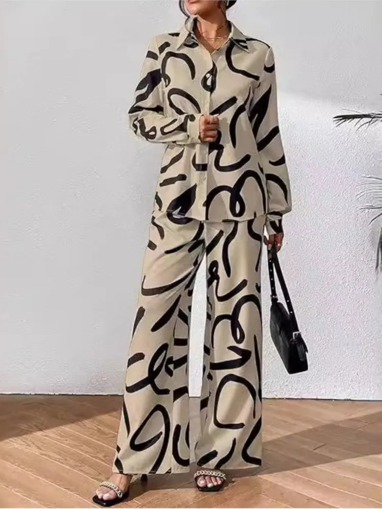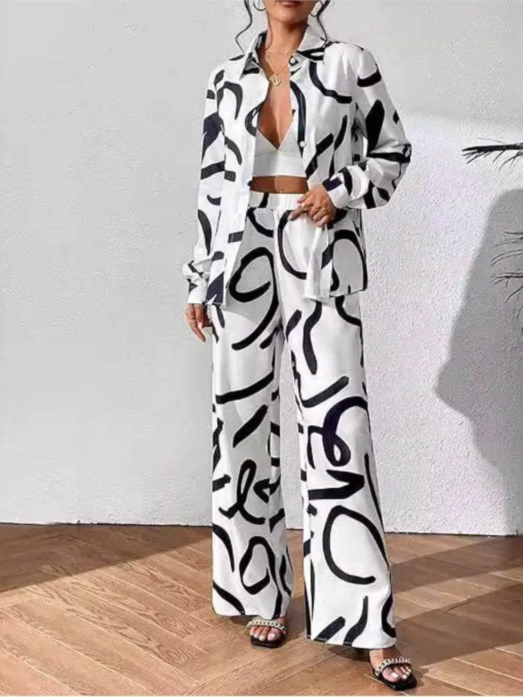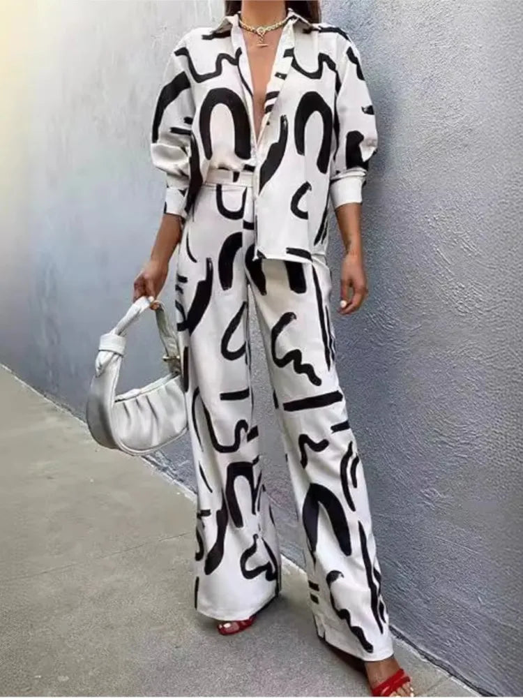 Women Clothing 2024 Autumn New Fashion Print Set Casual Button Collar Shirt Long Sleeved Wide Leg Pants Long Pants Two-piece Set